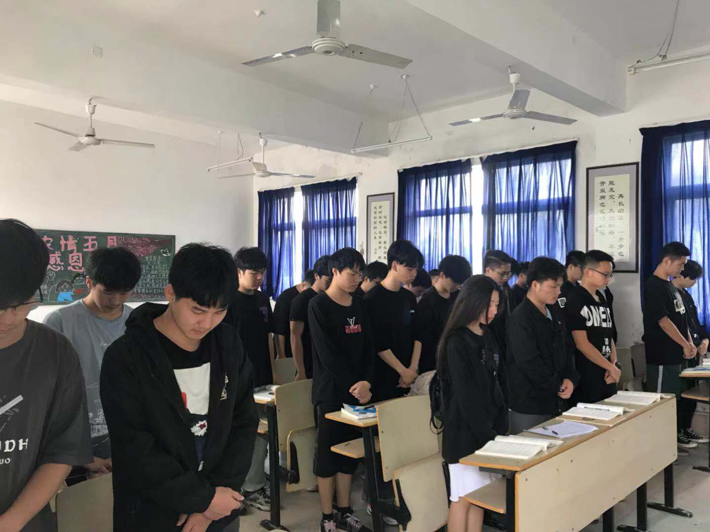 上课的学生在教室静立默哀