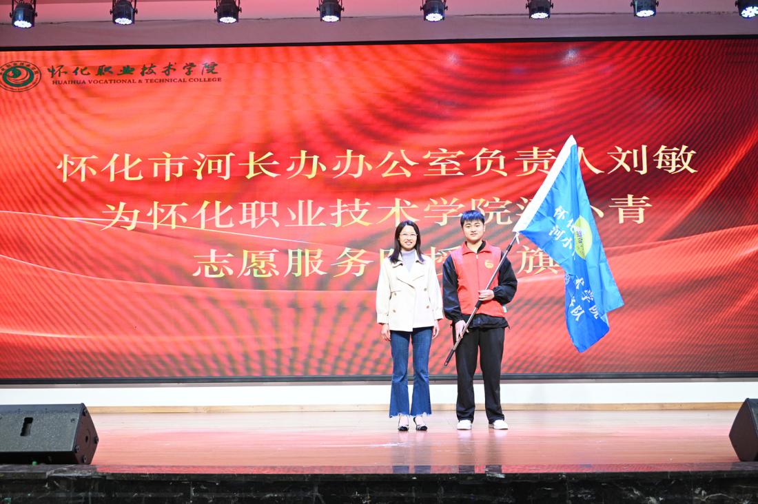 怀化市河长办办公室负责人刘敏为学校“河小青”志愿服务队授队旗