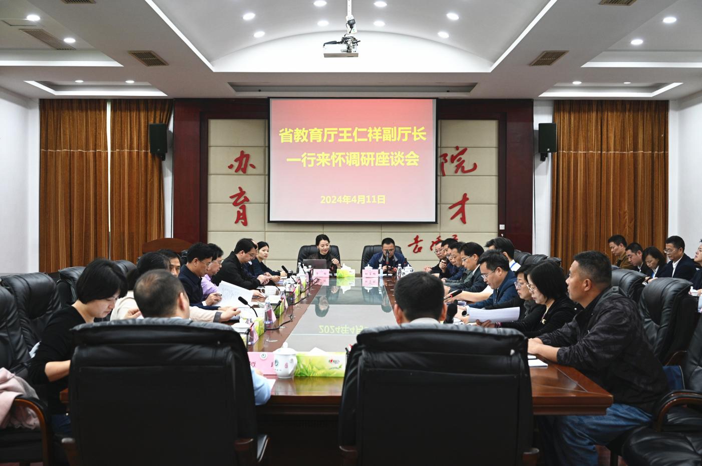 4月11日,省教育厅副厅长王仁祥、省司法厅立法处处长彭荣卫、省教育厅职成处处长崔书芳一行到beat365调研指导工作。怀化市政府副秘书长尹少中、教育局党组书记、局长蒋正平,校党委书记胡扬帆及在家校领导陪同调研。