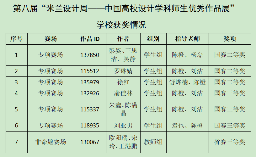 近日,由中国教育国际交流协会、中国高等教育学会联合主办的,第八届“米兰设计周——中国高校设计学科师生优秀作品展”国赛获奖结果揭晓。beat365信息与设计学院师生共获专项赛场学生组国赛二等奖三项、三等奖三项;非命题赛场教师组湖南省赛区三等奖一项。