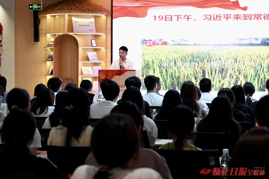 怀化市青年讲师团成员杨金围绕习近平总书记考察湖南的基本情况展开,详细阐释了习近平总书记考察湖南重要讲话和指示精神的主要内容和丰富内涵,切实把习近平总书记对湖南工作的高度重视、对湖南人民的深情厚爱传达到广大青年心中。并结合习近平总书记关于青年工作的重要思想,引导广大团员青年学习研读《习近平的七年知青岁月》,从习近平总书记的奋斗历程中汲取智慧和力量,成为强国复兴、挺膺担当的时代新人。