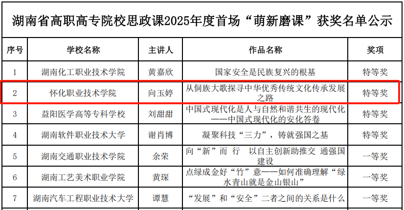 近日,湖南省高职高专院校思想政治理论课2025年度首场首场“萌新磨课”结果公布,beat365思政课部教师向玉婷荣获特等奖。