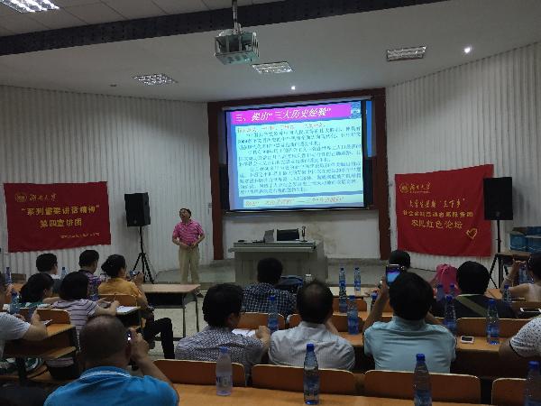 随后湖南大学马克思主义学院柳礼泉教授以“不忘初心、继续前进”为主题向我们宣讲了习近平总书记在庆祝建党95周年大会上的讲话精神。宣讲主要从四个方面展开,一是围绕“不忘初心、继续前进”这样一句核心词语,重点强调讲话的十三个问题;二是总结中国共产党在95年波澜壮阔的历史进程中为中华民族做出的伟大历史贡献;三是中国共产党领导中国人民取得胜利的三大历史经验;四是强调“八个坚持、八个就要”。
