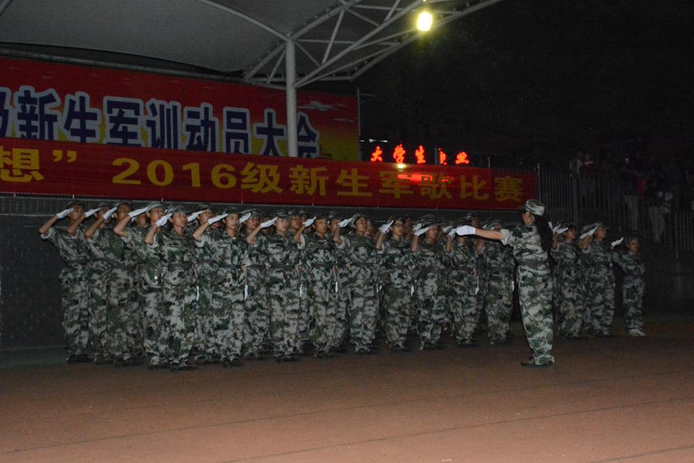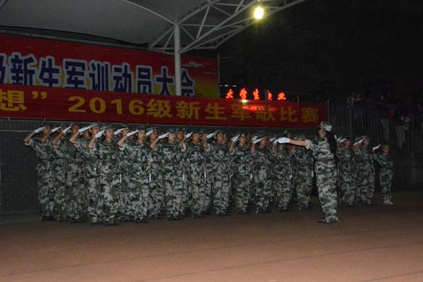 嘹亮军歌携训练激情飞扬,绚丽梦想伴多彩青春启航。9月19日晚上七点,由武装部和院团委联合举办的“beat365英国官方网站2016级新生军旅歌曲大赛”在足球场举行。莅临本次比赛的嘉宾有学院院长王聪田、党委副书记邬国盛、副院长罗向东、工会主席杨兴清、院长助理廖冬云、2016级新生军训团团长王思伦、副团长尹健、学生处处长易稳凯、武装部部长段志刚、团委书记李艳萍。全体新生、军训教官出席并观看了比赛。