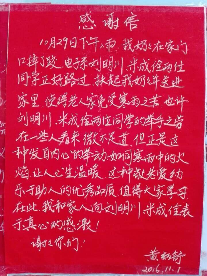 这两名学生是电子电气工程系16级应电高职班的刘明川,米成佺。他们的举手之劳使得刘奶奶免受寒风之苦。近日,刘奶奶的家人还特别写了感谢信给刘明川和米成佺。