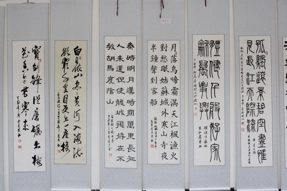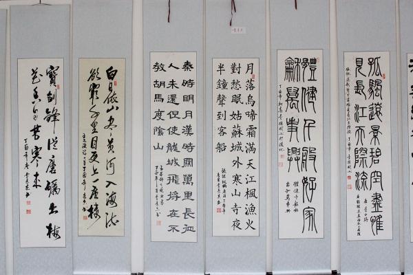 本次书法展,由校友舒兴华发起,舒兴华、舒伍、田旺三位校友赞助。书法展共展出了60余副书法作品,分为教师作品 、校友作品和学生作品三个部分。这些书法作品,书体概全,风格迥异,字里行间,或笔走龙蛇,或行云流水。