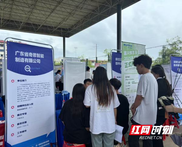 不远处,湖南一道前行高速铁路旅客运输有限公司的展位前已排起长队,“目前已经有四十多位学生来了解,还有不少学生选择线上咨询。”副总经理李德志边整理资料边说。