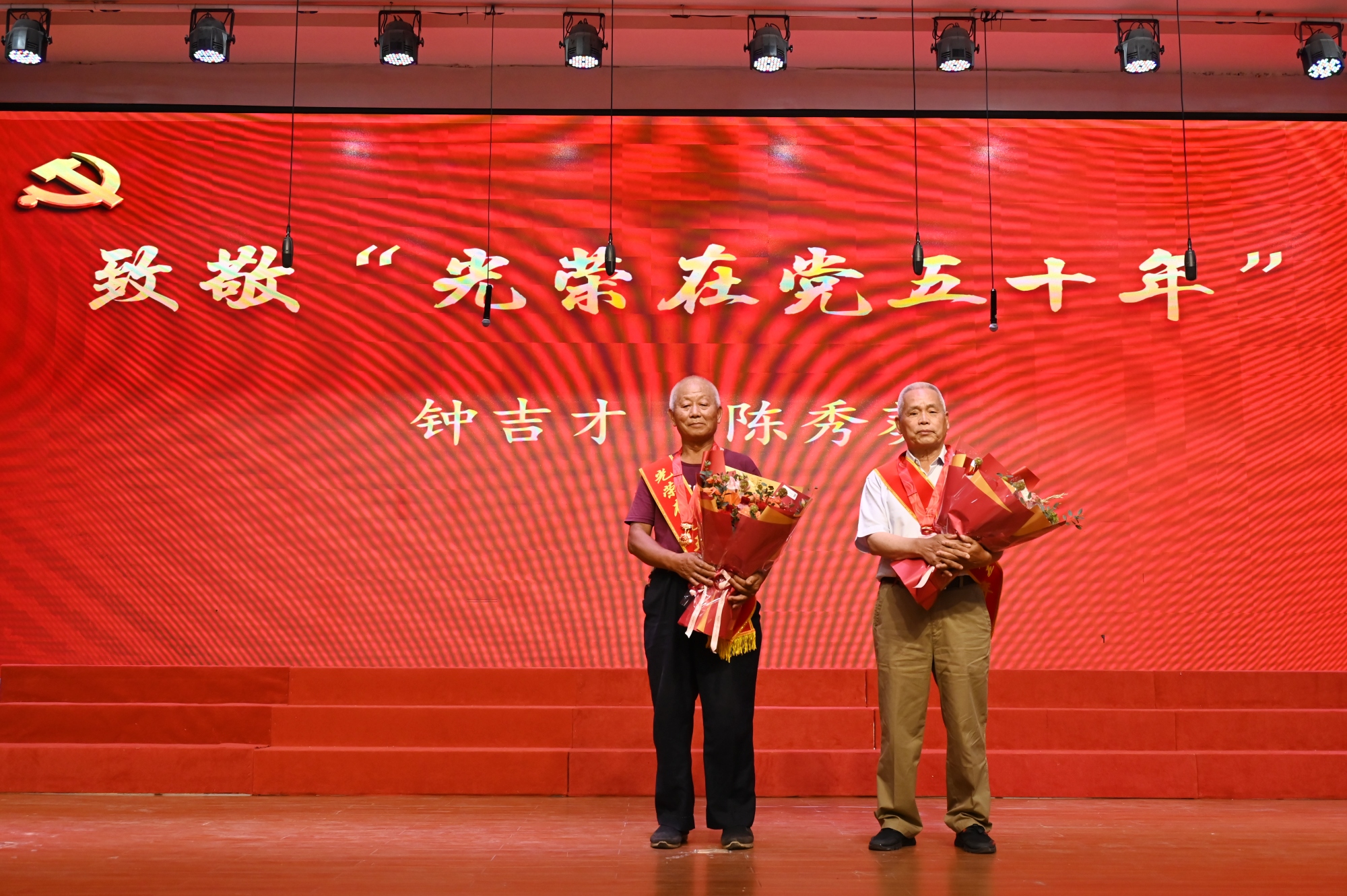 会上,组织全体党员重温入党誓词,为“光荣在党五十年”的老党员代表颁发纪念章,观看学校成果展示,表彰了10名青年岗位能手、10名青年教工党员示范岗、10名党务工作示范岗、1名“双带头人”标兵、2个“双带头人”教师党支部书记工作室创建单位、3个党建工作样板支部、2个党建工作标杆院系、5个突出贡献奖。随后,举行了“红心永向党奋进新征程”迎“七一”文艺汇演,通过《唱支山歌给党听》《党的赞歌》《我们是共产主义接班人》《没有共产党就没有新中国》等节目,向党的生日献礼。